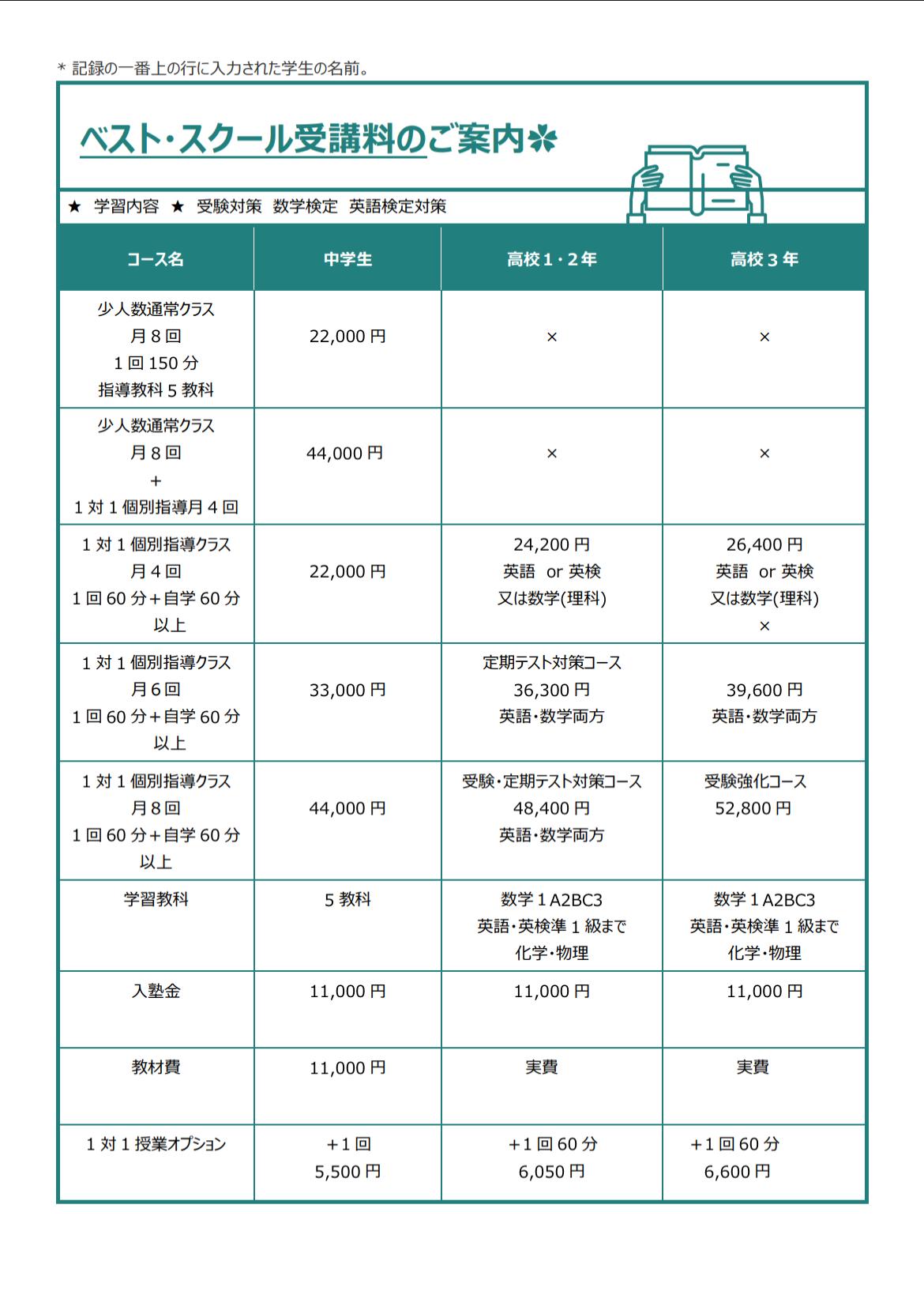 | 中学生 週2回 | 5教科 150分 22,000円 |